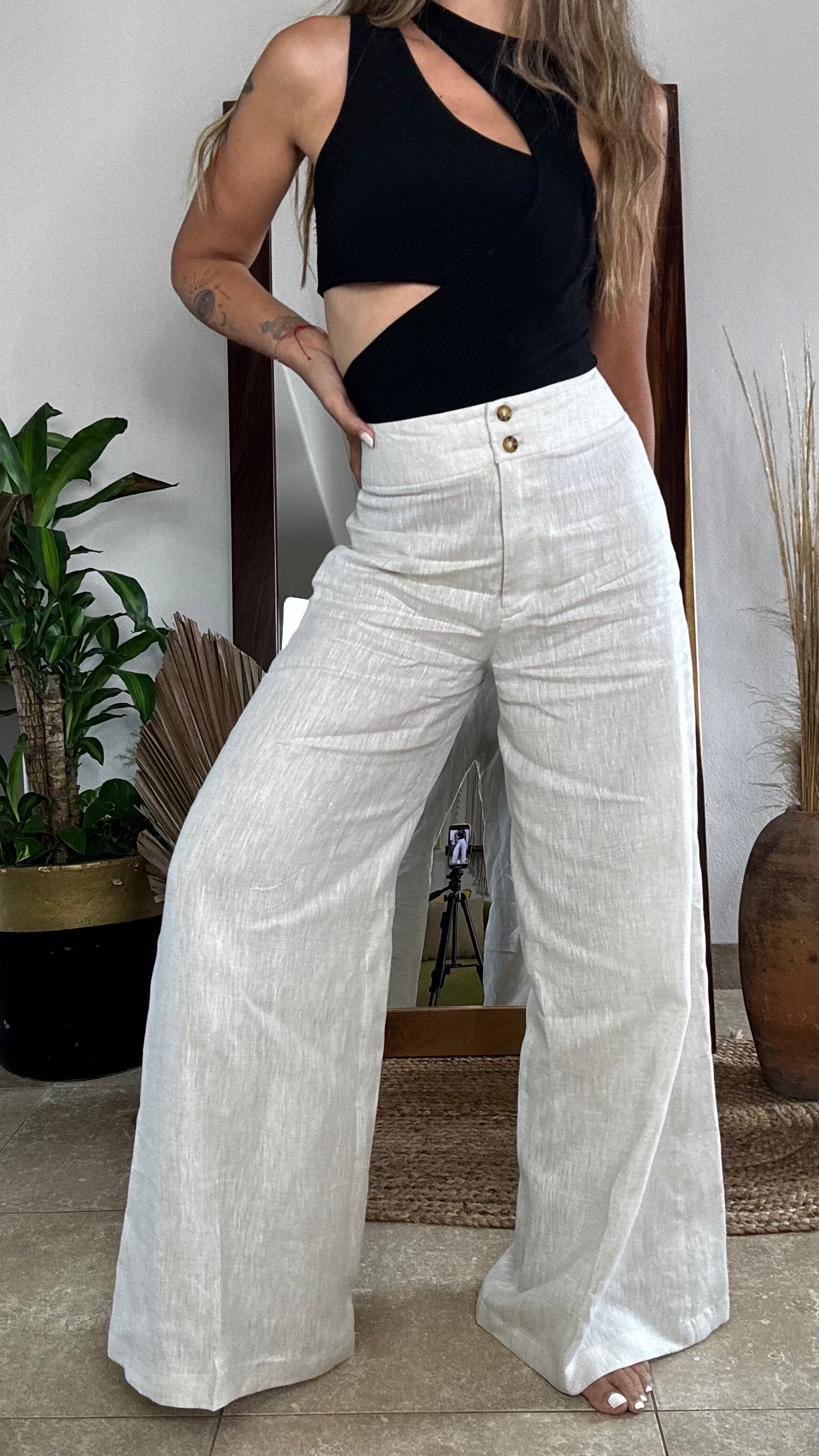 Pantalón de lino con corte pata ancha, pretina alta y cierre frontal con botones. Una pieza elegante y fresca, perfecta para un look sofisticado y versátil.