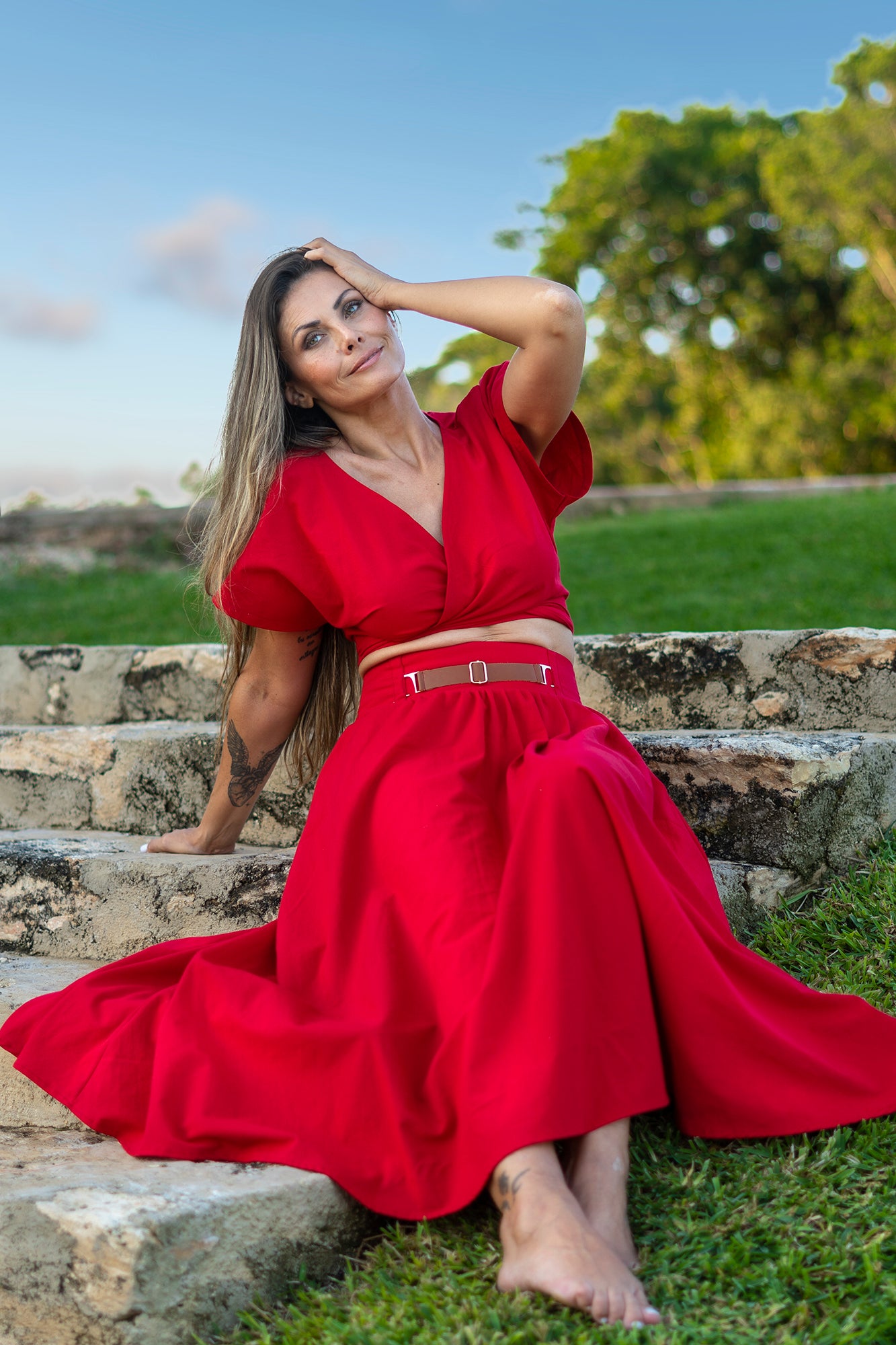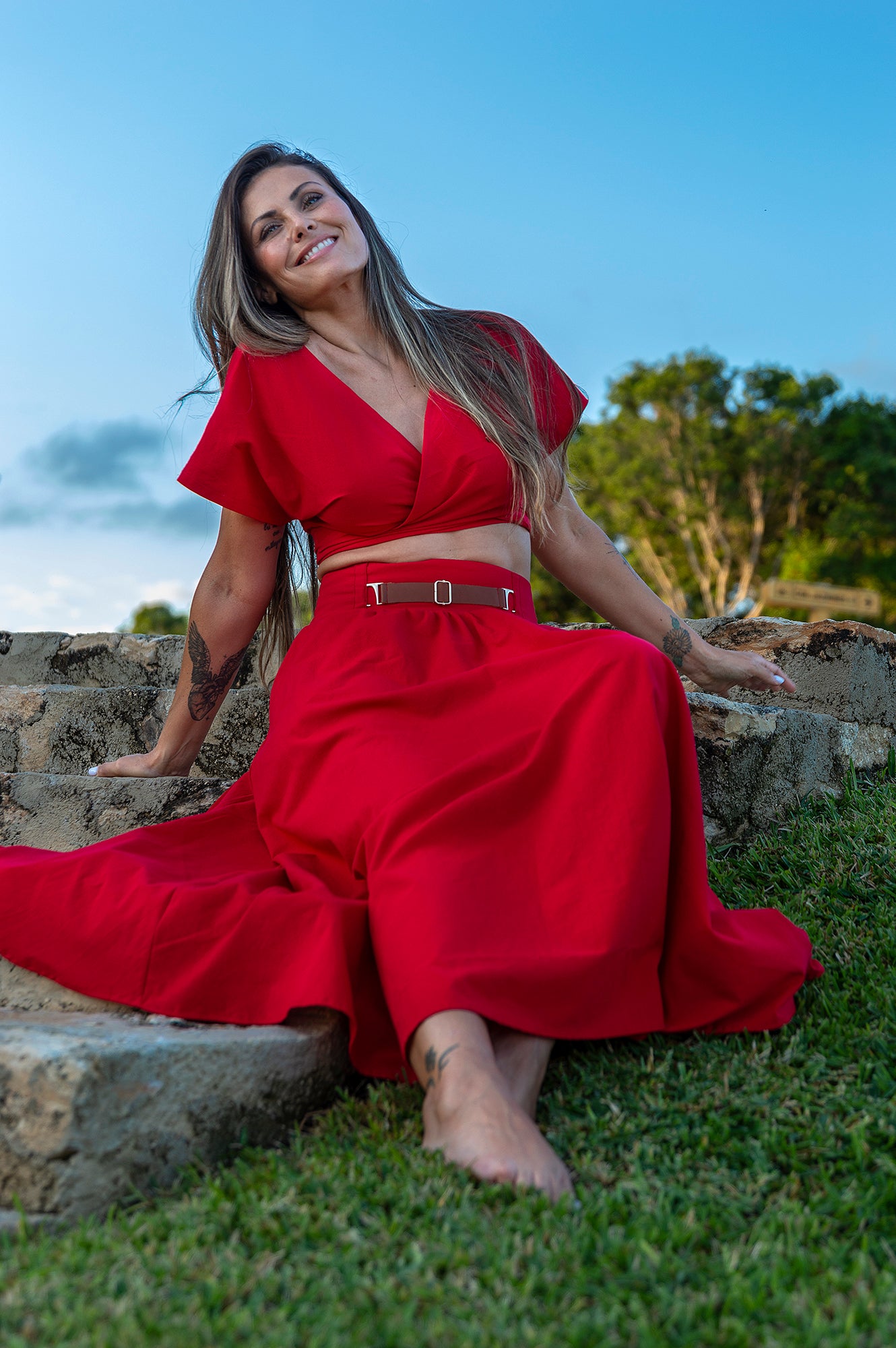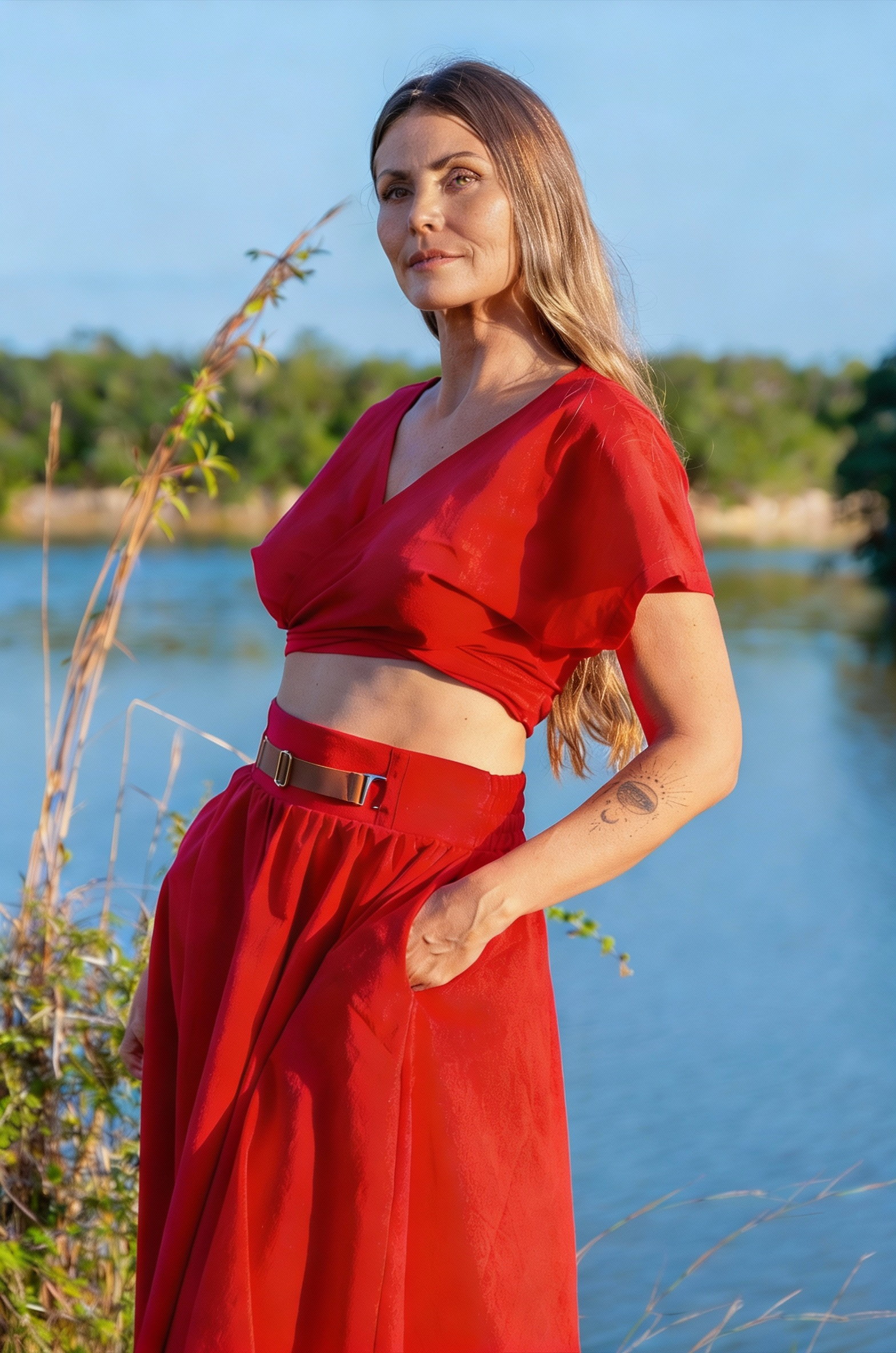 Set de top cruzado y falda confeccionado en manta de algodón 100%, pensado para acompañar el cuerpo con suavidad y libertad.